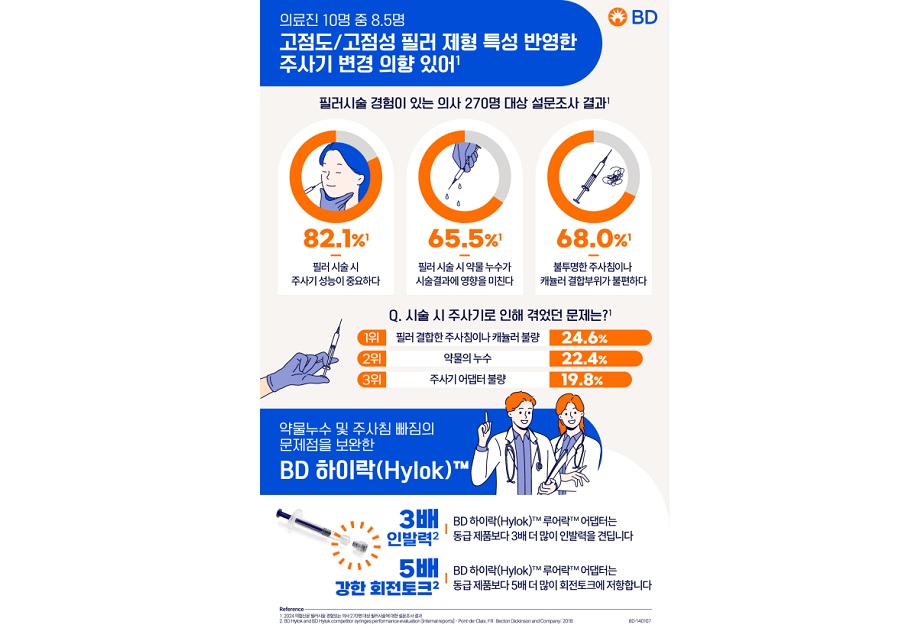 BD코리아는 의협신문과 함께 피부과, 성형외과, 가정의학과 등 필러 시술 경험이 있는 의사 270명을 대상으로 필러시술에 대한 설문조사를 실시했다. 조사 결과에 따르면 조사 대상 270명 중 164명이 필러 시술 중 주사침과 캐뉼러가 빠진 경험이 있다고 응답했다.