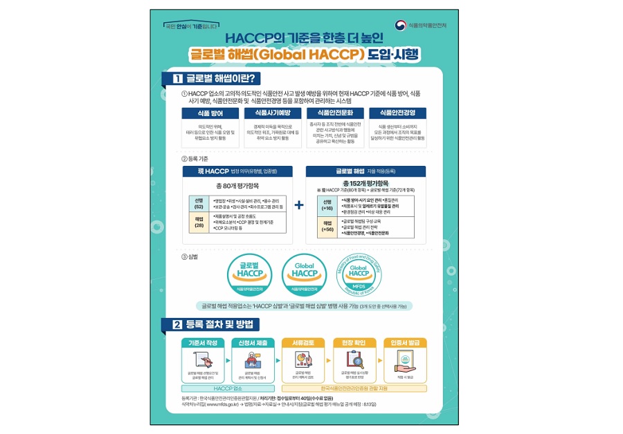 식품의약품안전처(처장 오유경, 이하 식약처)는 8월 4일 국내·외 식품 제조 환경·기준 변화 등에 발맞춰 국제기준에 부합하는 글로벌 해썹(Global HACCP) 등록 기준 신설 등을 주요 내용으로 하는 「식품 및 축산물 안전관리인증기준」을 일부 개정 고시했다고 밝혔다.