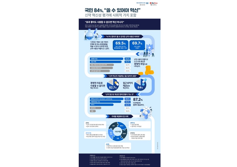 설문조사 전문기관 엠브레인이 실시한 「신약 혁신성에 대한 국민 인식 조사」 결과, 국민 대다수가 ‘신약의 혁신성’ 평가에 치료 효과뿐 아니라 환자가 실제로 사용할 수 있는지 여부까지 포함되어야 한다고 인식하는 것으로 나타났다. 이번 조사는 글로벌 제약사 비원메디슨(BeOne Medicines)의 후원으로, 국민의 신약 접근성 인식과 개선 필요성을 객관적으로 파악하기 위해 2025년 8월부터 10월까지 진행됐다. 전국 만 20세 이상 성인 남녀 1,000명이 참여했으며, 이 중 암 또는 중증질환 환자 및 보호자 200명 이상이 포함됐다.