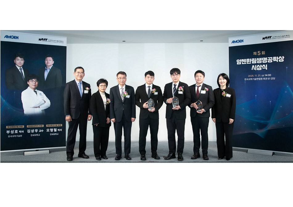 암젠코리아(대표 신수희)와 한국과학기술한림원(원장 정진호, 이하 한림원)은 지난 11월 21일 한림원 회관에서 ‘제5회 암젠한림생명공학상’ 시상식을 개최하고, 생명과학 및 생명공학 분야에서 혁신적인 연구 성과를 이룬 젊은 연구자 3인을 시상했다.