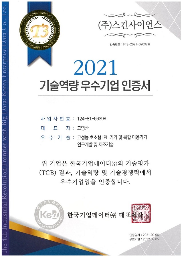 스킨사이언스가 2021년 한국기업데이터에서 실시한 기술평가에서 기술역량과 기술경쟁력 우수기업으로 인증받았다고 9월 28일 밝혔다.