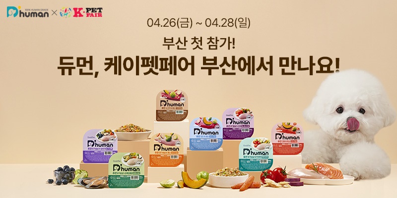 반려견을 위한 휴먼그레이드 자연화식 브랜드 '듀먼(D'human)'(대표 정수철)이 4월 26일부터 28일까지 부산 벡스코(BEXCO)에서 열리는 '2024 케이펫페어 부산'에 참가해 다채로운 이벤트와 함께 듀먼의 인기 제품들을 선보인다.