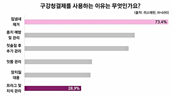 구강청결제를 사용하는 이유로는 ‘입냄새 제거’(73.4%)가 1위를 차지했고, 구강질환 예방을 위한 ‘프라그 및 치석관리’(28.9%)는 가장 낮은 순위를 기록했다. 이를 통해 구강청결제를 사용하는 대다수가 구강청결제를 단순히 ‘구취 제거’를 위한 도구로 인식하고 있으며, 구강건강(충치 예방, 잇몸 관리, 프라그 및 치석 관리)을 위해 사용하는 비율은 비교적 낮은 것으로 나타났다.