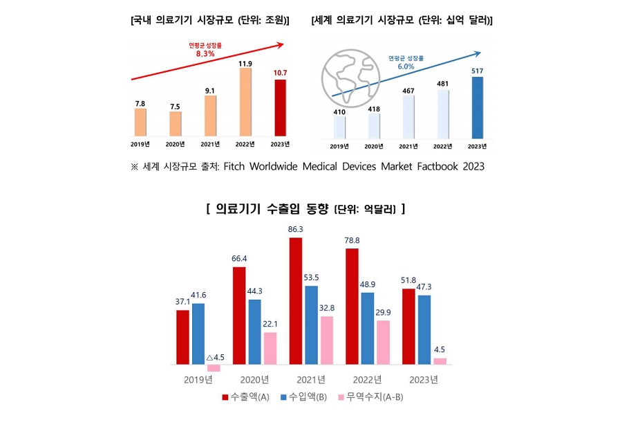 2023년 국내 의료기기산업 무역수지가 5,878억 원(4.5억 달러) 흑자를 기록하며 2020년 이후 4년 연속 흑자를 달성했다.