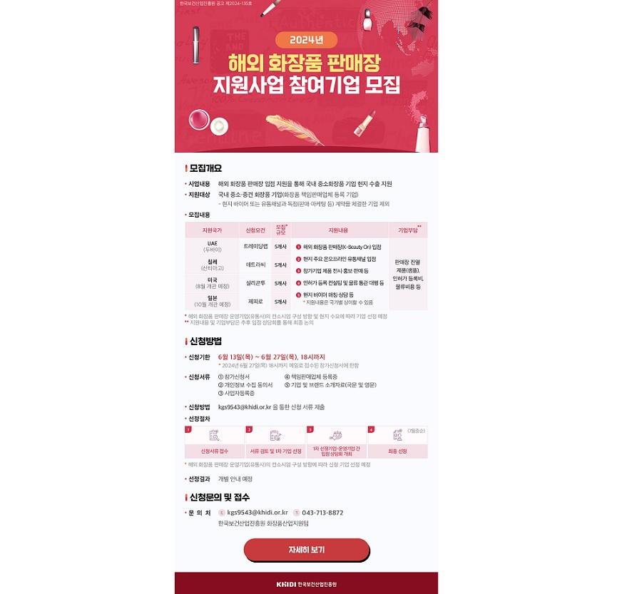 지원사업 신청과 관련한 자세한 내용은 진흥원 홈페이지(www.khidi.or.kr) 사업 공고란 「해외 화장품 판매장 참여기업 모집 공고」를 통해 확인할 수 있다.