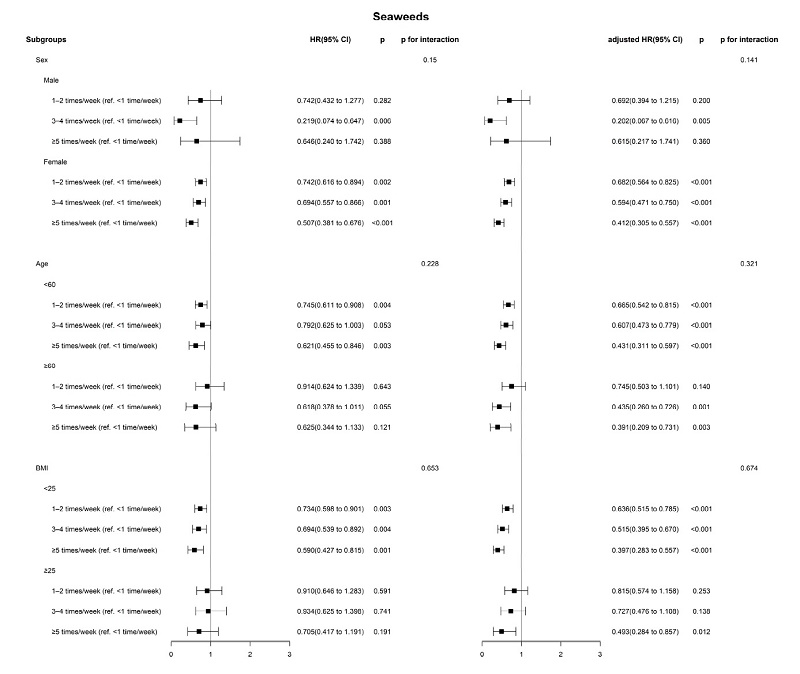 각 음식별로 섭취군 간 갑상선암 유병률 차이를 알아봤다. 해조류 주 5회 이상 섭취군은 주 1회 미만 섭취군보다 유병률이 58% 낮았다. 주 3~4회 섭취군, 주 1~2회 섭취군은 주1회 미만 섭취군보다 각각 43%, 32% 낮아 해조류 섭취 횟수가 늘수록 유병률이 비례하게 떨어졌다.