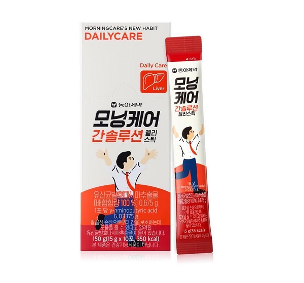 이번 신제품은 액상스틱 파우치 형태의 간 보호 건강기능식품 ‘모닝케어 간솔루션’을 젤리스틱 형태로 개발한 제품으로 알코올성 손상으로부터 간을 보호하는데 도움을 준다고 알려진 식약처 개별인정형 소재 ‘유산균발효다시마추출물’이 함유됐다.