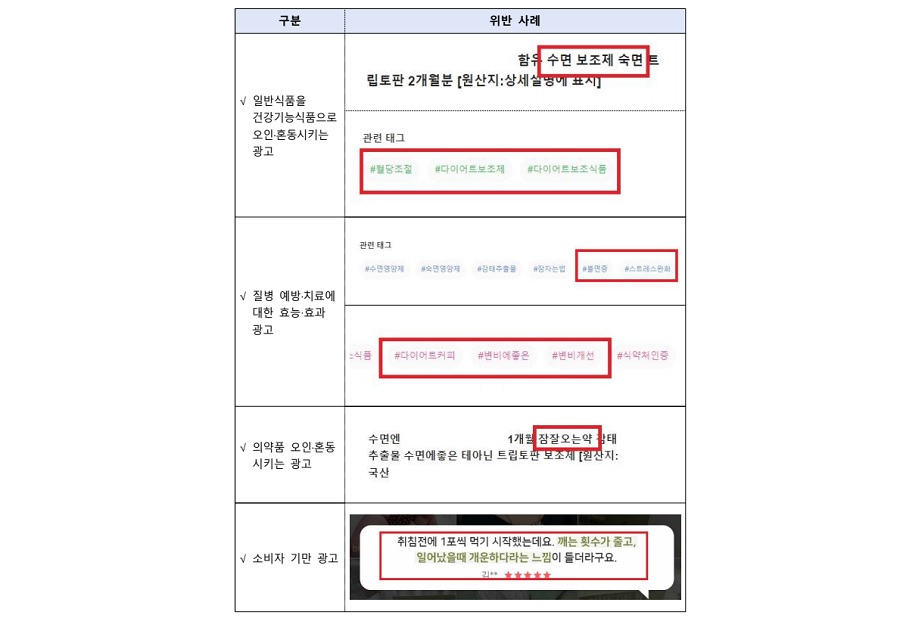 주요 위반 내용은 ▲ 일반식품에 ‘수면건강’, ‘수면영양제’, ‘다이어트’ 등으로 광고하여 건강기능식품으로 인식하게 만드는 광고(28건, 50.0%) ▲‘불면증’, ‘변비에 좋은’ 등으로 광고해 질병의 예방‧치료에 효능이 있는 것으로 인식할 우려가 있는 광고(5건, 8.9%) ▲‘잠 잘오는 약’ 등 의약품으로 인식하게 만드는 광고(1건, 1.8%) ▲‘취침 전에 1포씩 먹기 시작했는데요 깨는 횟수가 줄고, 일어났을 때 개운하다라는 느낌이 들더라고요’, ‘20대 김○○님 체형 전·후 사진’ 등 구매 후기 또는 체험기를 이용해 소비자를 현혹하는 광고(1건, 1.8%) ▲자율심의기구로부터 건강기능식품의 광고·판매에 관한 사전 자율심의를 받았으나, 심의 내용과 다르게 광고(1건, 1.8%) ▲ 국내 반입차단 대상 원료·성분(센노사이드) 함유된 해외직구식품(20건, 35.7%) 등이다.