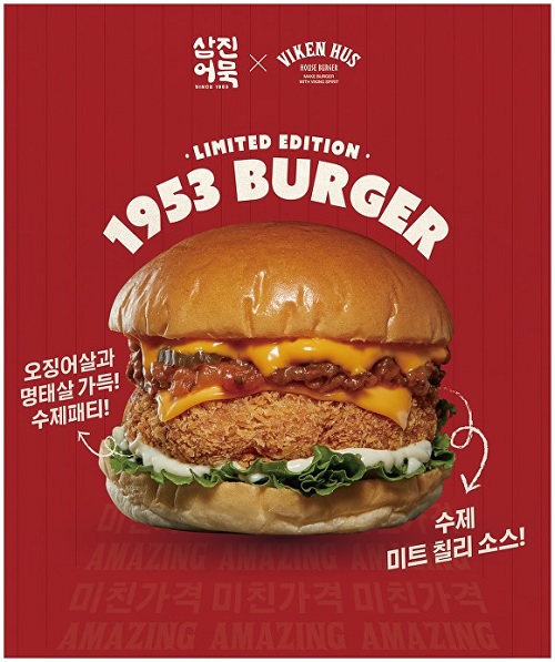 씨푸드 수제버거 브랜드 ‘비킹후스'는 대표 어묵 브랜드 삼진어묵과 협업해 개발한 어묵 패티를 활용해 어묵버거 ‘1953버거’를 한정 출시했다.