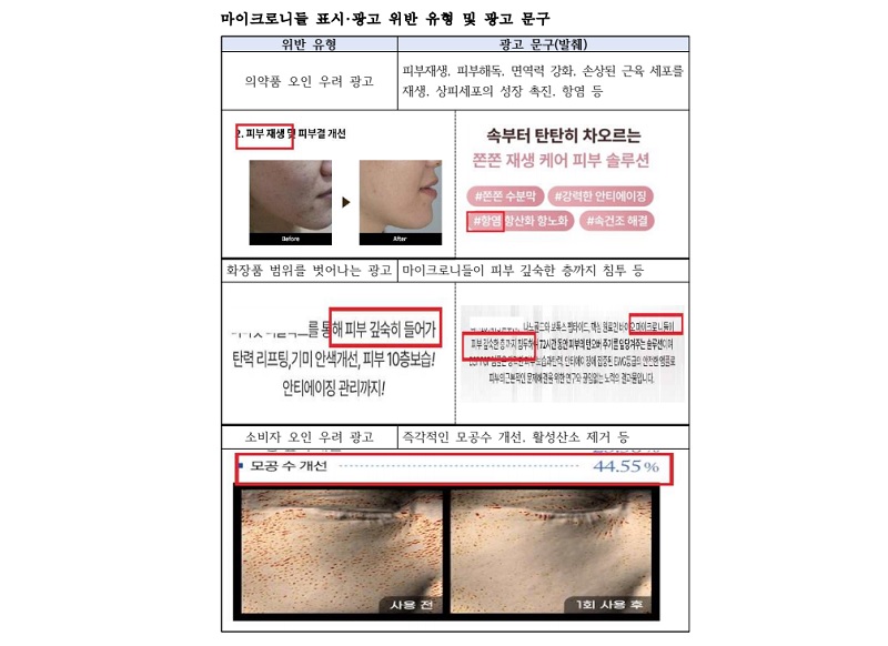 그럼에도 일부 업체에서 침 모양 화장품 원료가 피부 표피를 관통하고 진피층까지 도달하여 의료시술과 유사한 효능·효과가 나타나는 것처럼 광고하여 의약품으로 잘못 인식할 우려가 있거나 화장품의 범위를 벗어나는 표시·광고를 하고 있었다.