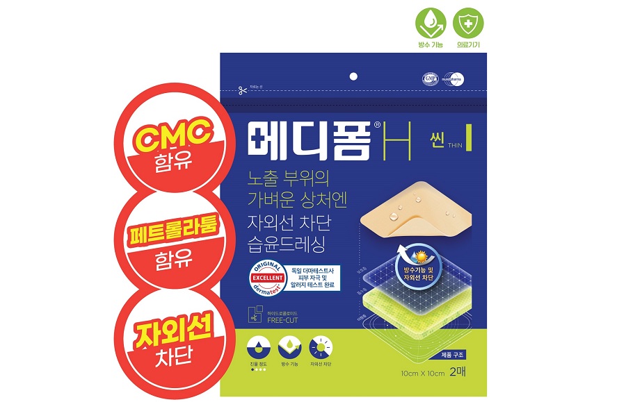 한국먼디파마 정승희 브랜드매니저는 “상처 발생 시 물과 땀, 외부 오염 물질로 인해 상처가 오염되거나 덧나지 않도록 상처 부위를 깨끗하게 씻어낸 뒤 습윤드레싱으로 즉시 상처를 덮어주는 것이 좋다”며 “메디폼 H씬은 3대 방어막(자외선, 물, 땀)역할과 진물 흡수, 방수 기능은 물론, 페트롤라툼과 CMC 성분이 함유되어 있어 효과적으로 상처를 밀착보호 할 수 있다는 것이 큰 장점으로 여름철 상처관리에 적합한 제품”이라고 말했다.