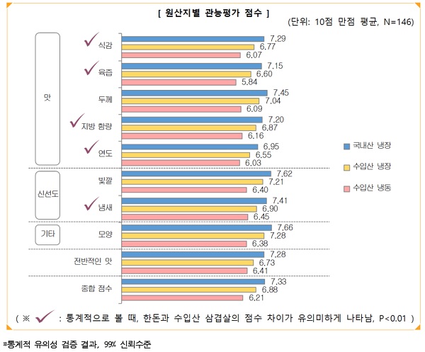 식감, 육즙, 지방함량, 빛깔, 냄새 등을 평가하는 관능조사에서 한돈 냉장 7.33점, 수입산 냉장 6.88점, 수입산 냉동 6.21점을 받았다. 한돈이 수입산 냉장/냉동에 비해 맛과 신선도 면에서 특히 우수하다는 점을 알 수 있다.