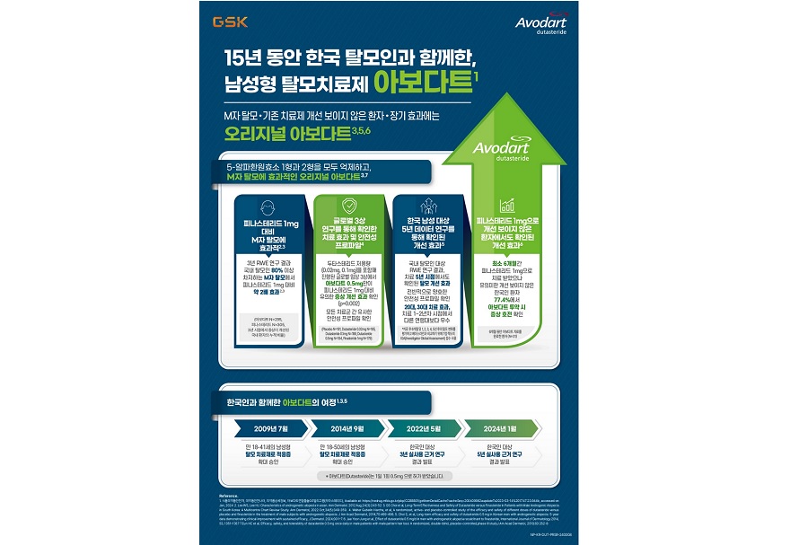 한국GSK 제네럴메디슨 사업부 이동훈 전무는 “5알파환원효소 1, 2형을 모두 억제해 M자, 정수리 등 다양한 유형의 남성 탈모를 치료하는 오리지널 듀얼 억제제(Dual inhibitor) 아보다트의 국내 남성형 탈모 치료 적응증 허가 15주년을 맞이하며, 그간 아보다트가 남성 탈모인들의 곁에서 이뤄온 성과를 되돌아볼 수 있는 인포그래픽을 발표하게 돼 뜻깊다”며 “앞으로도 한국 GSK는 국내 탈모인들을 위해 보다 효과적이고 안전한 탈모 치료제 공급을 위해 최선을 다할 것”이라고 밝혔다.