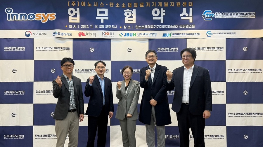 정형외과 임플란트 연구제조 전문기업 이노시스(대표이사 정주미)가 지난 18일 전북대학교병원(병원장 양종철) 탄소소재의료기기개발지원센터(센터장 한갑수)‧글로벌혁신의료기술실증지원센터(센터장 윤선중)와 협력하여 국내는 물론 아시아 최초로 탄소소재 척추 임플란트를 개발해 국산화를 실현하기 위한 업무협약(MOU)을 체결했다고 밝혔다.