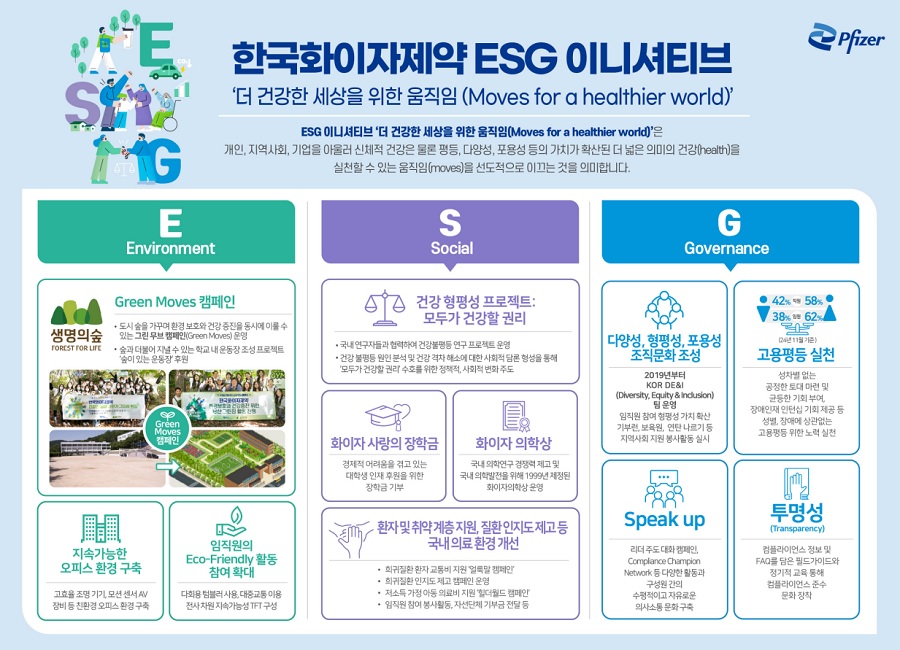 환경 부문에 있어 한국화이자제약은 환경보호 및 개인, 자연, 지역사회의 건강을 제고하는 데에 동참하는 ‘그린 무브(Green Moves)’ 캠페인의 일환으로, 올해는 2022년부터 함께 활동해온 생명의숲이 운영하는 ‘숲이 있는 운동장’ 프로젝트에 1,000만원의 후원금을 전달했다. 후원금은 서울 종로구에 위치한 국립서울농학교 학생들의 자연 접근성을 높이기 위해 운동장 내 숲을 조성하는 데에 활용될 예정이다. 숲이 있는 운동장 프로젝트는 사용빈도가 떨어지는 운동장 공간을 학생들에게 생태적, 신체적 활동 경험을 제공하는 공간으로 탈바꿈시킴으로써 성장기 학생들의 지속가능한 미래에 대한 관심과 실천을 높이는 것을 목표로 하고 있다.