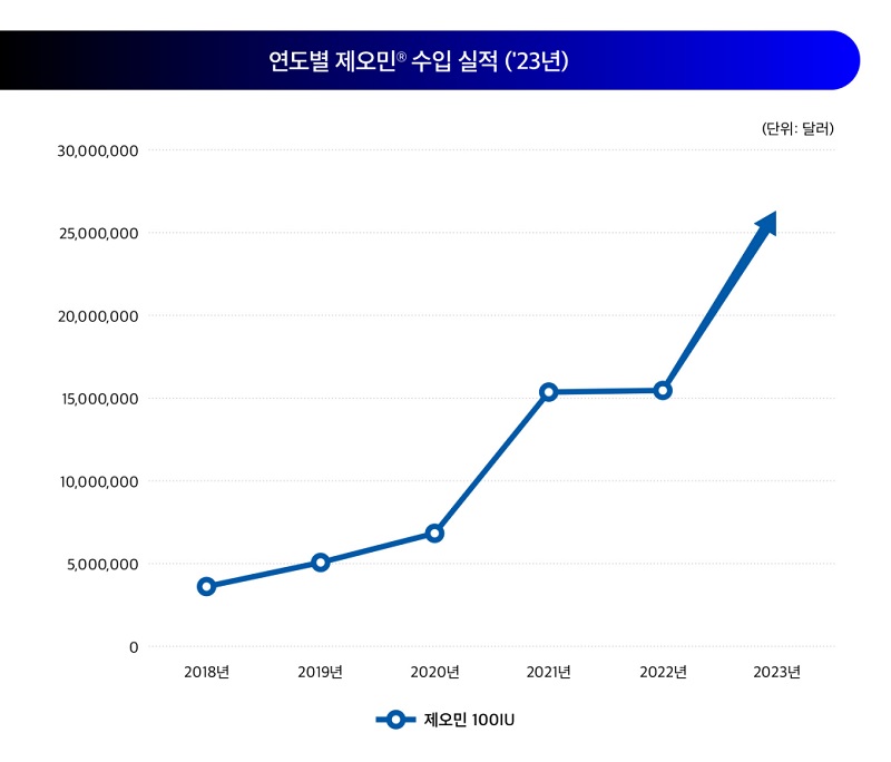식품의약품안전처에 따르면 2023년 제오민100단위(IU)의 수입실적은 2,627만 7,972달러로, 가장 높은 수입 실적을 유지했다. 특히, 제오민100단위(IU)는 2018년부터 국내 수입 실적에서 꾸준한 성장세를 이어오며 두드러진 성과를 보여주고 있다. 이러한 결과는 제오민이 국내 의료진과 소비자로부터 지속적으로 신뢰받고 있음을 보여주는 지표로 평가된다.