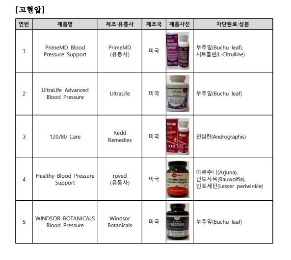 검사결과 혈압조절, 혈당강하 관련 성분이 검출되지는 않았으나 고혈압 치료·완화(5개), 고지혈증 치료·완화(8개), 당뇨병 치료·완화(9개) 효능·효과 표방 제품에 국내 반입차단 대상 원료·성분이 표시된 것으로 확인됐다.