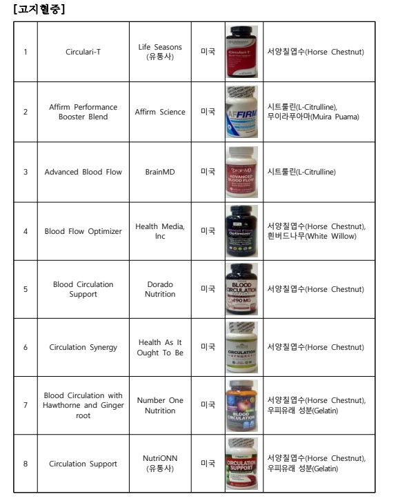 고혈압 치료·완화 효과 표방 제품에서는 식품에 사용할 수 없는 ‘부추잎(Buchu leaf, 3건)’, ‘천심련(Andrographis, 1건)’, ‘아르주나(Arjuna, 1건)’, ‘인도사목(Rauwolfia, 1건)’과 의약품 성분인 ‘시트룰린(L-Citrulline, 1건)’이 확인됐다.