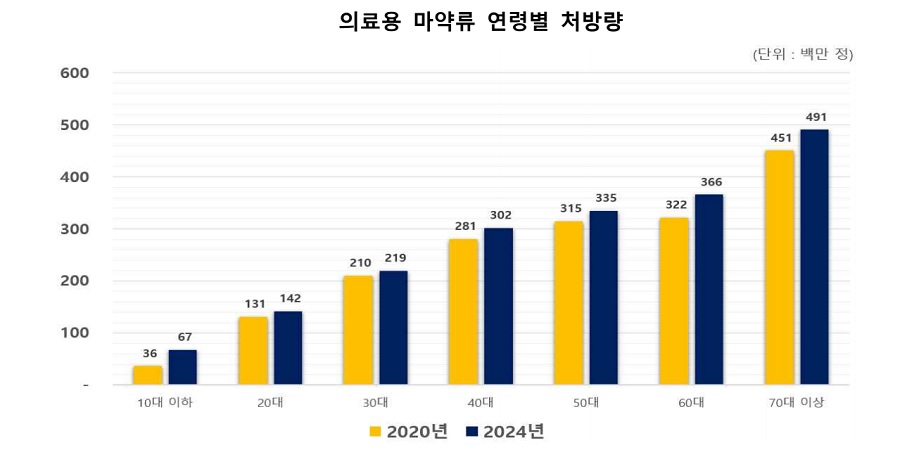 의료용 마약류 처방 건수는 약 1억 건, 처방량은 19억 2,663만 개로 최근 5년 동안 지속적으로 증가했고, 연령별 처방량도 매년 증가하는 것으로 분석됐다.