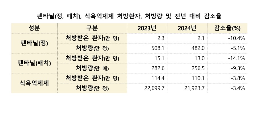 반면 최근 5년 동안 감소 추이가 보이는 효능군과 성분은 식욕억제제와 펜타닐(정, 패치)인 것으로 집계됐다.