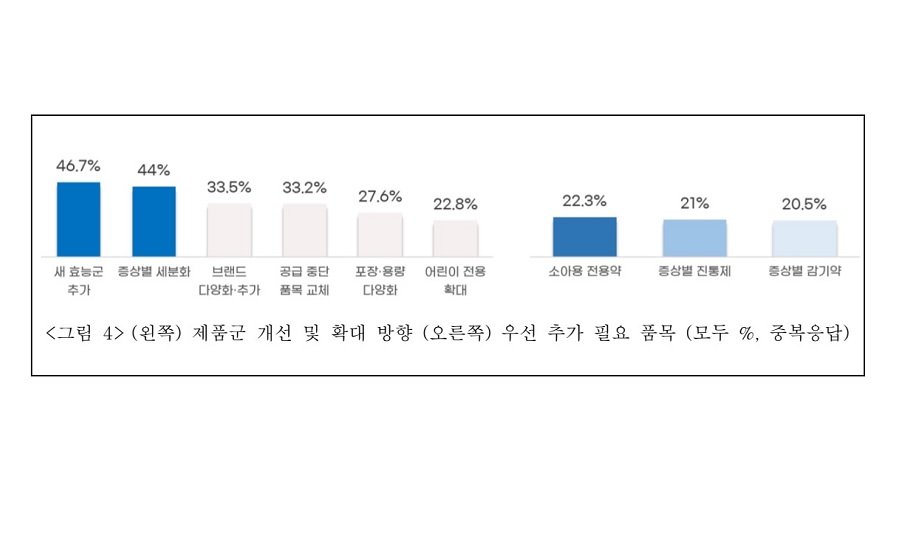 둘째로 구체적 개선 방향에 대한 의견도 뚜렷하게 나타났다. 2023년 조사와 마찬가지로 품목 확대 필요성에 동의한 응답자들은 ‘새 효능군 추가’(46.7%)와 ‘증상별 세분화’(44.0%)를 최우선 개선과제로 제시했다. 세부적으로는 ▲소아용 전용약(22.3%) ▲증상별 진통제(21.0%) ▲증상별 감기약(20.5%) 순으로 확대 요구가 높게 나타나, 지난 조사에서 확인된 주요 개선 요구가 여전히 유효함을 확인했다. 특히 소아용 전용약에 대한 높은 수요는 심야시간 편의점에서 안전상비약이 소아 응급상황 대응에 빈번히 활용되고 있는 현실을 반영한 결과로 분석된다. 또한 증상별 진통제와 감기약 확대 요구는 최근 일반의약품 시장의 세분화 트렌드와 함께, 변화하는 사회·경제적 환경에 따른 국민 수요를 반영한 사례다.